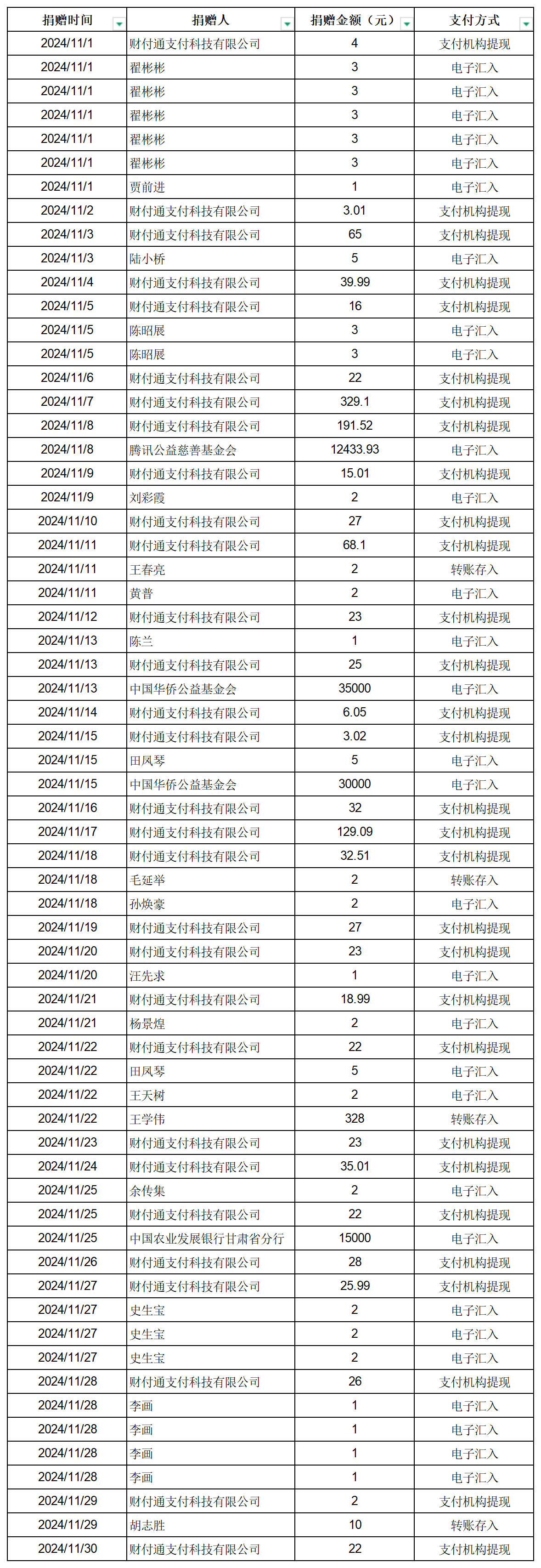 2024年张掖市慈善协会积极搭建爱心平台,得到广大爱心人士和爱心单位积极响应,踊跃捐款捐物,现将(2024年11月1日--11月30日)银行转账收入公示如下: