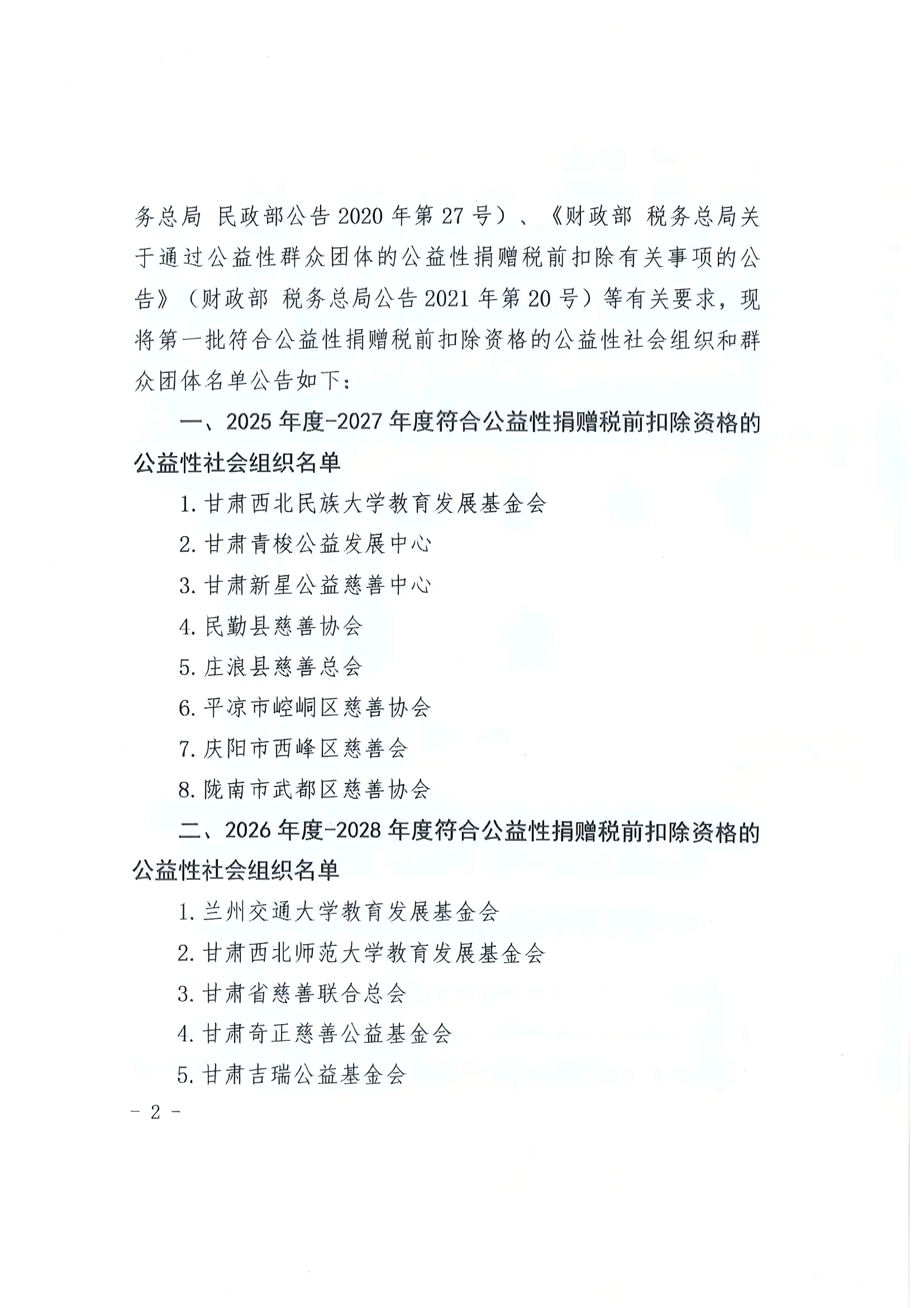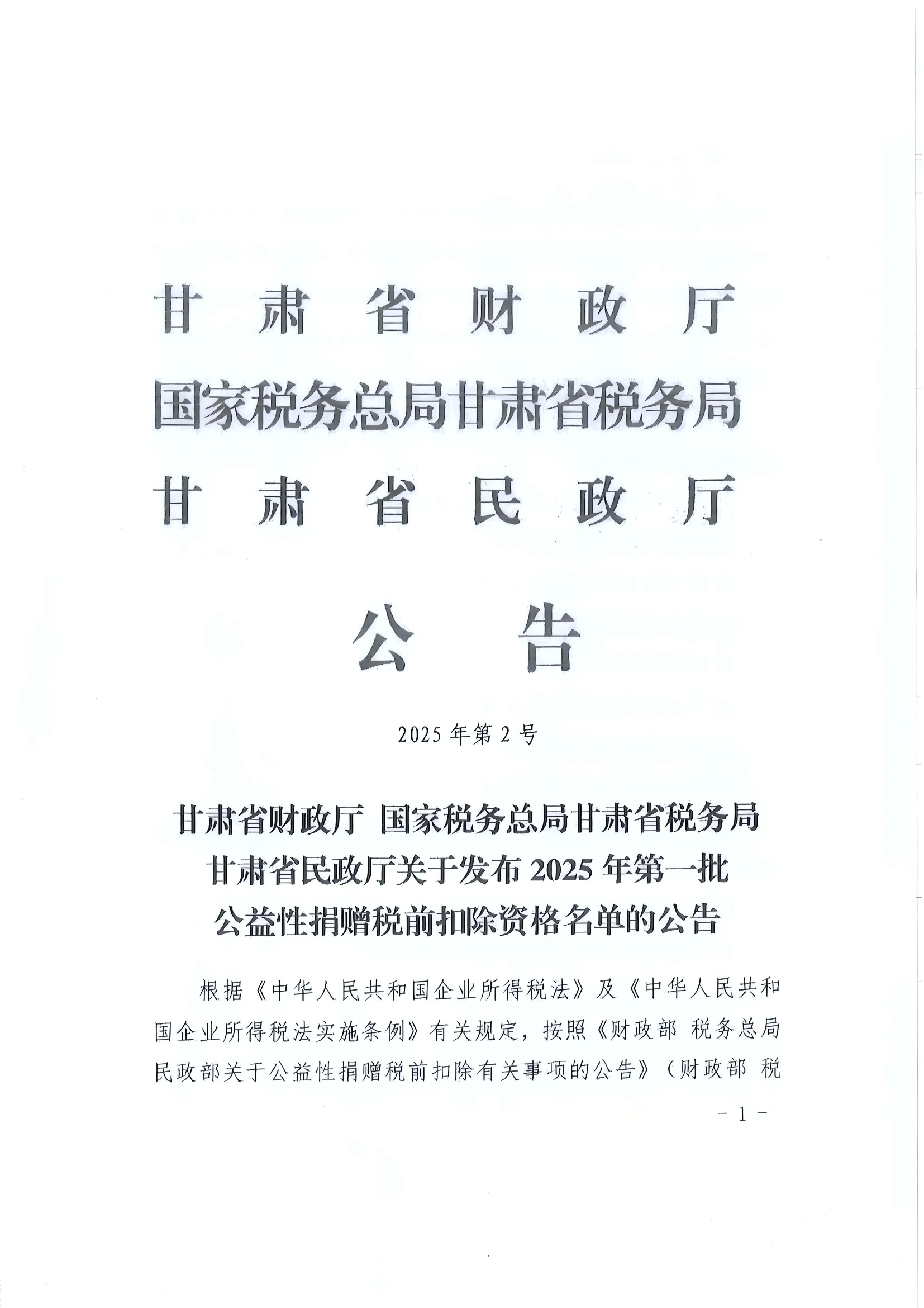 公告| 甘肃省财政厅国家税务总局甘肃省税务局甘肃省民政厅关于发布 2025年第一批公益性捐赠税前扣除资格名单的公告