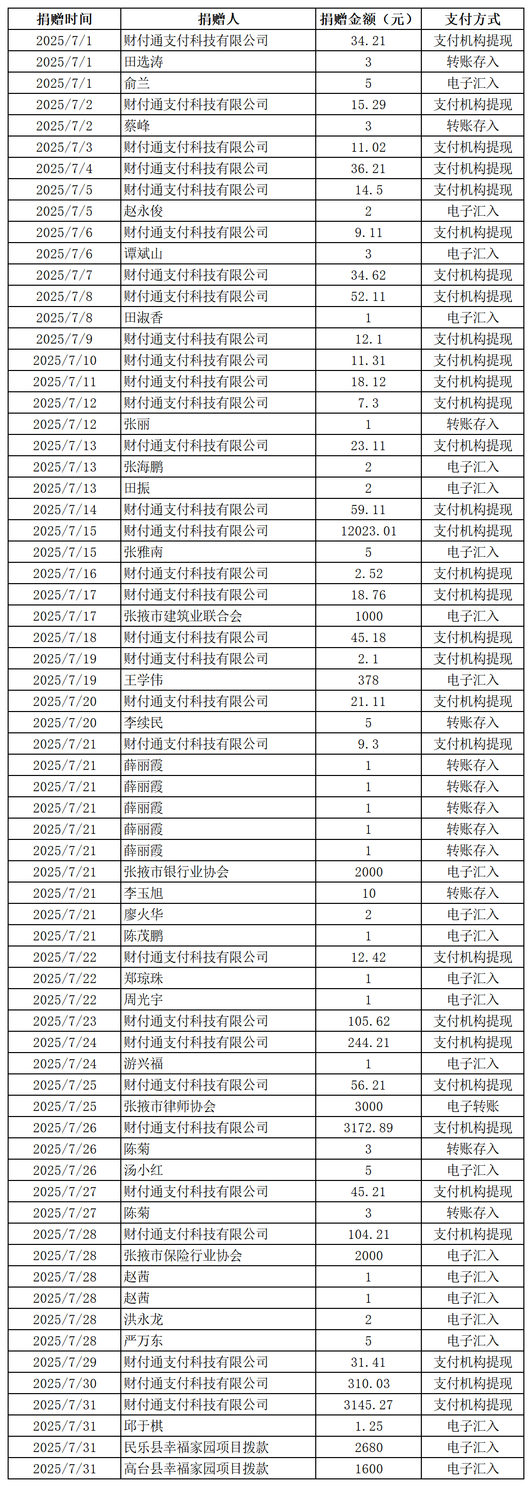 2025年张掖市慈善协会积极搭建爱心平台,得到广大爱心人士和爱心单位积极响应,踊跃捐款捐物,现将(2025年7月1日--7月31日)接收到的银行转账收入公示如下: