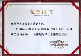 7月,协会被中央社会工作部、民政部等21个部门推选为全国志愿服务“四个100”最佳志愿服务组织;11月,荣获民政部第五次“全国先进社会组织”称号;12月,连续荣获甘肃省慈善联合总会“全省慈善工作先进单位”;张掖慈善成为甘肃公益慈善领域的亮丽名片。